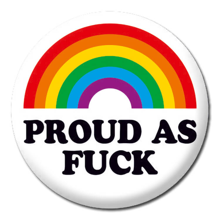 A white badge with a half rainbow and underneath bold rounded black text that reads Proud as fuck.