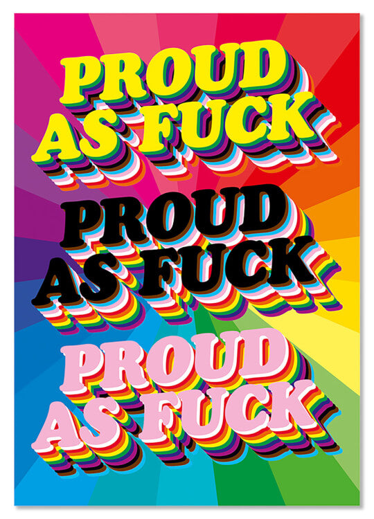 A rainbow postcard with the words Proud as Fuck repeated in the colours of the progress pride flag.