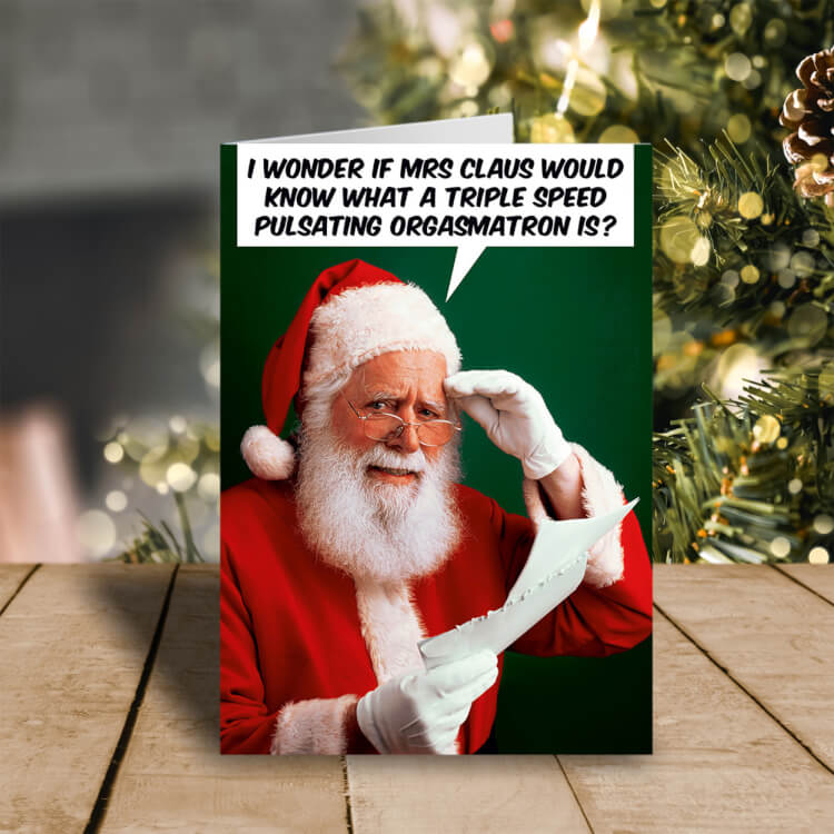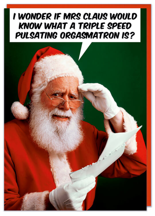 A Christmas card with a retro picture of a confused looking Father Christmas holding a list. He's saying I wonder if Mrs Claus knows what a triple speed pulsating orgasmatron is?