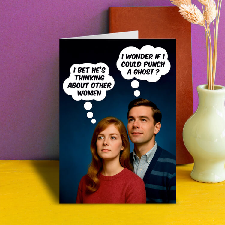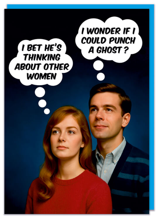 A funny birthday card featuring a retro picture a young couple looking off to the distance in contemplation against a dark blue background. She is thinking I bet he's thinking about other women. He's thinking I wonder if I could punch a ghost?