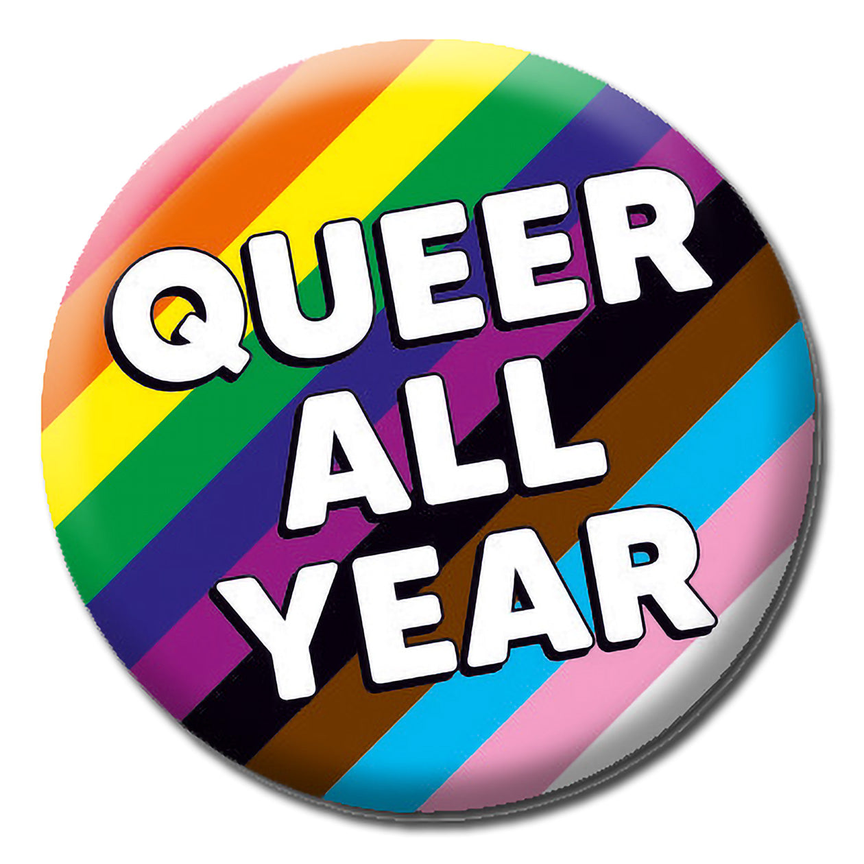 A round badge featuring diagonal rainbow stripes in a wide range of bright colours. Bold white block text across the centre reads “Queer all year.” There are no images or symbols, just the striped background and text.