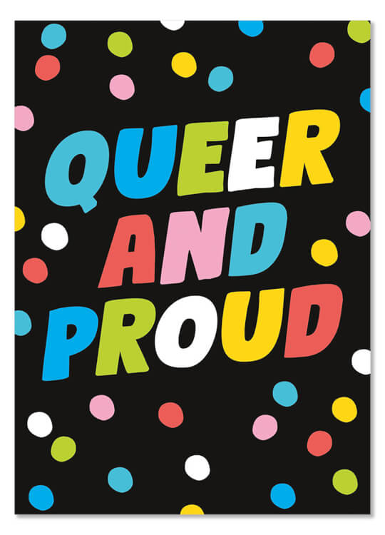 A black postcard with bold text in the middle in shades of blue, pink, yellow and white that read Queer and proud and surrounded by complimentary dots of the same colours