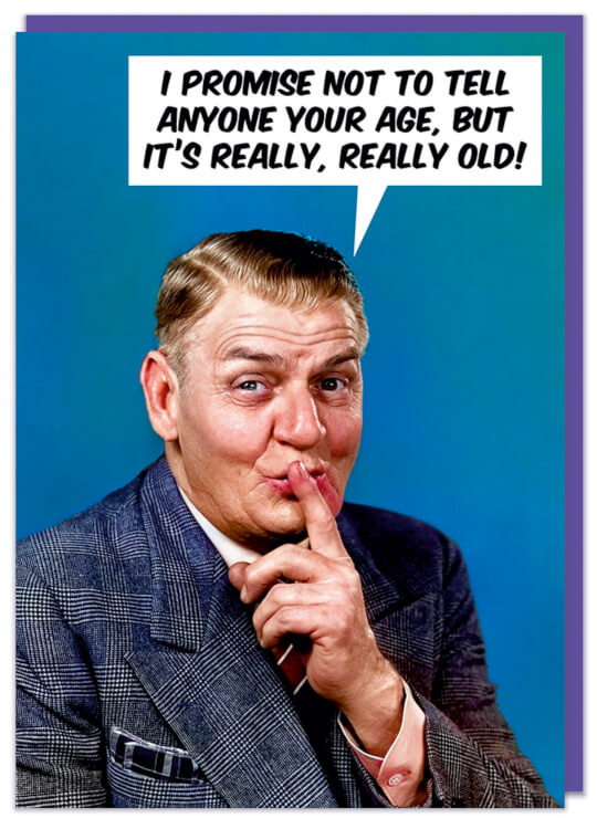 A birthday card with 1960s photo of a middle aged man with his finger to his mouth making a shh noise. He's saying I promise not to tell anyone your age but it's really, really old!