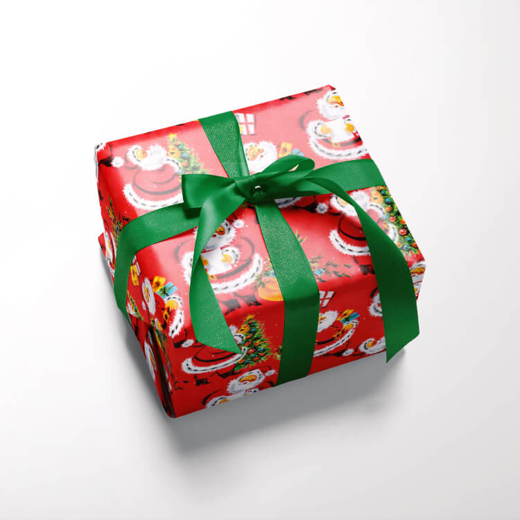 A festive wrapping paper with the repeating image of a smiling vintage Father Christmas illustrations against a festive red background.