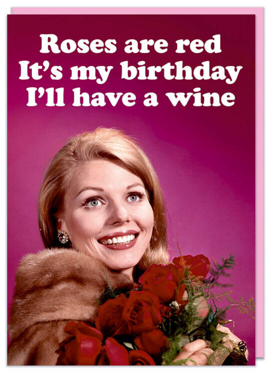 A funny retro birthday card featuring a glamorous young smiling woman holding a bunch of red roses. Rounded white text above her reads Roses are red, it's my birthday I'll have a wine.
