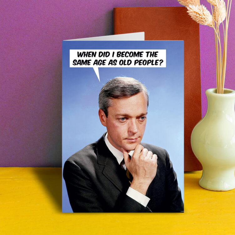 A greeting card with a 1960s photo of a serious looking older man in deep thought. He's saying When did I become the same age as old people?