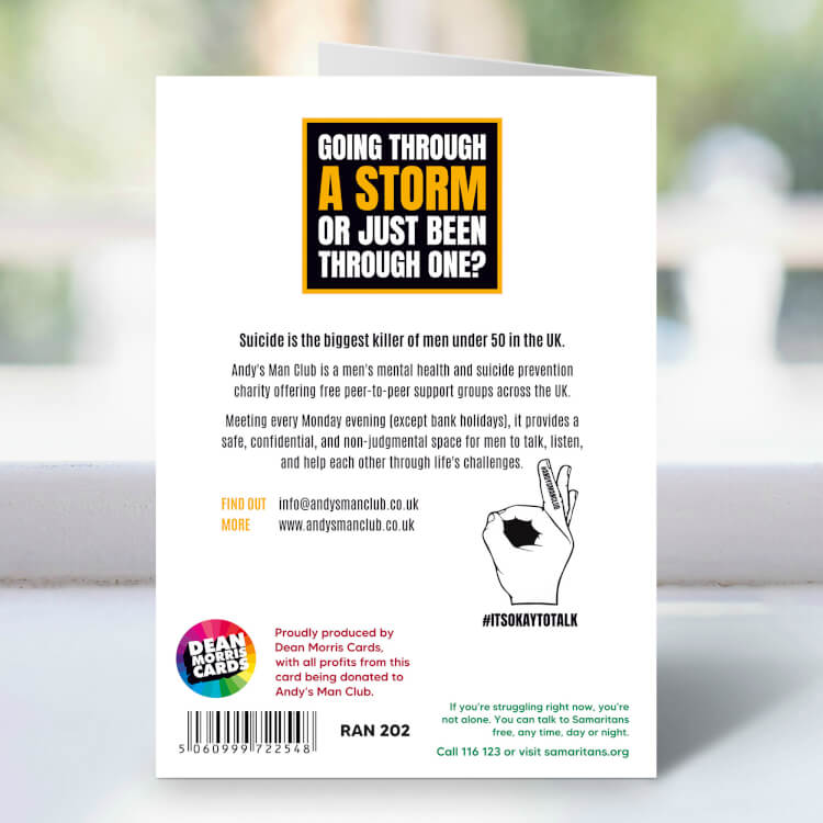 This card is designed to raise funds for Andy's, but also awareness with an introduction to the charity on the reverse. We hope that one man may read it, go along to their local club and through the support of other men, their fiends and family gets to enjoy another Christmas with them next year.