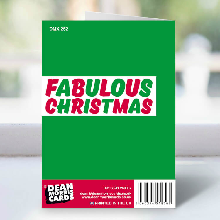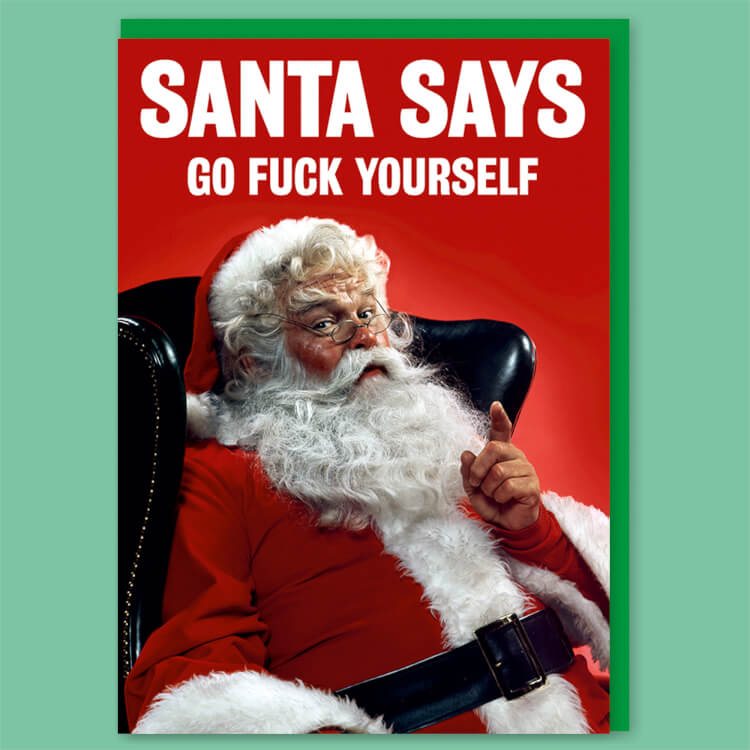 A Christmas card with a retro picture of Father Christmas sitting down in his chair looking to camera. Square white text above wishes the recipient Santa says go fuck yourself.