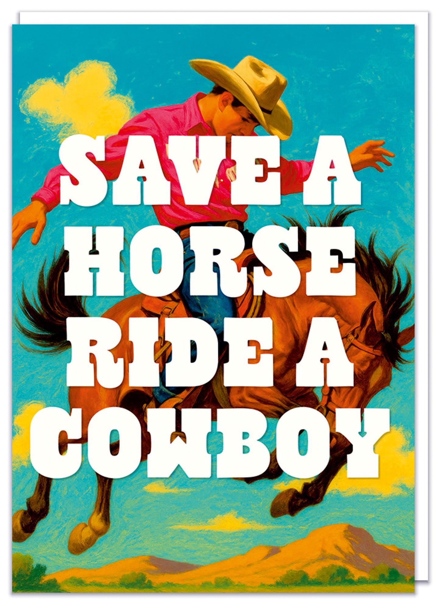 A funny greeting card with a kitsch 1950s illustration of a cowboy riding a horse overlaid with bold white western text that reads Save a horse ride a cowboy.