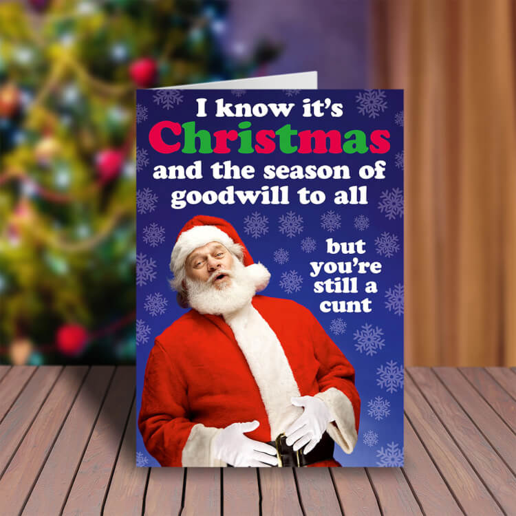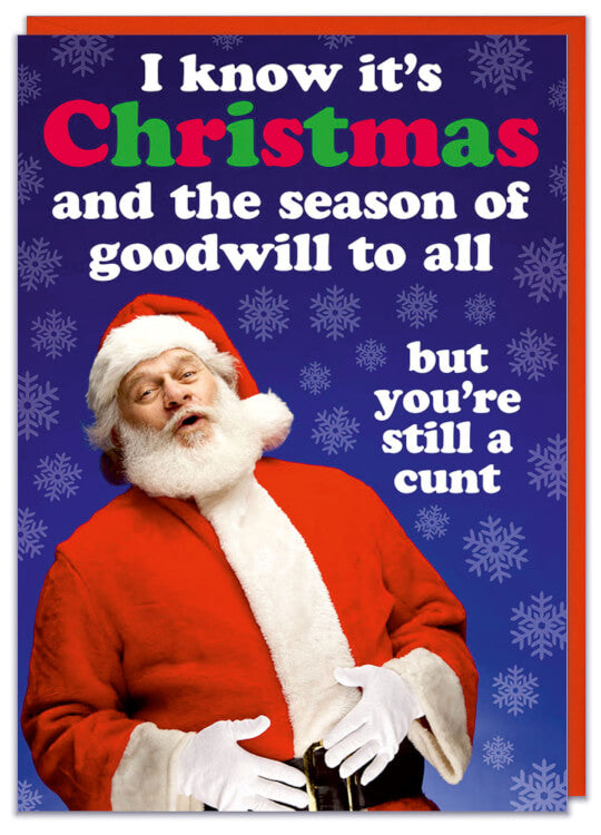 A Christmas card with a jolly red Santa Claus against a blue background with snowflakes. White, red and green text above and beside him reads I know it's Christmas and the season of goodwill to all but you're still a cunt.