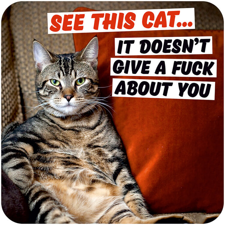 A coaster with a picture of a cat sitting up on an old fashioned arm chair and next to the cat are the words ‘See this cat... it doesn’t give a fuck about you’ in capitalised, red and black font against a white banner.