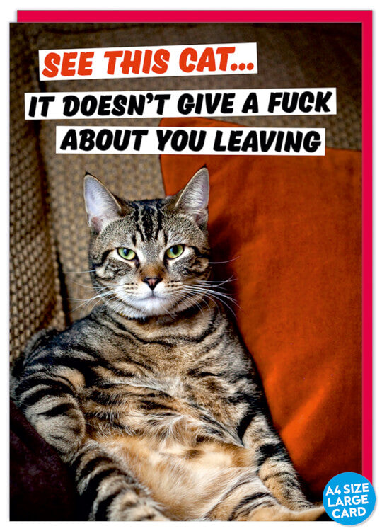A card with a picture of a cat sitting up on an old fashioned arm chair and next to the cat are the words ‘See this cat... it doesn’t give a fuck about you leaving’ in capitalised, red and black font against a white banner.