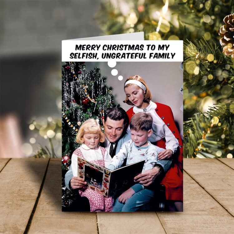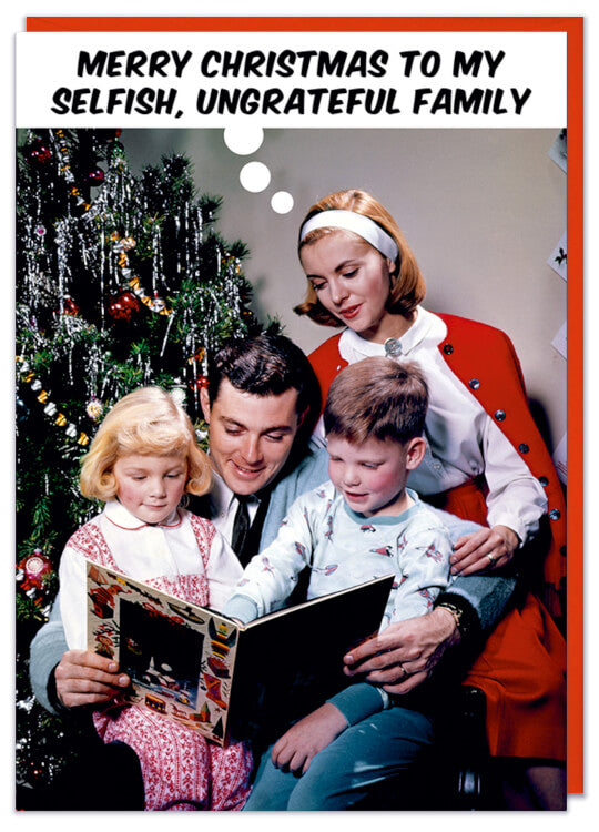 A Christmas card with a 1960s picture of a family in front of a Christmas tree. The father is a reading a story to his children while the mother looks on and is thinking Merry Christmas to my selfish, ungrateful family.