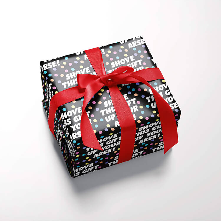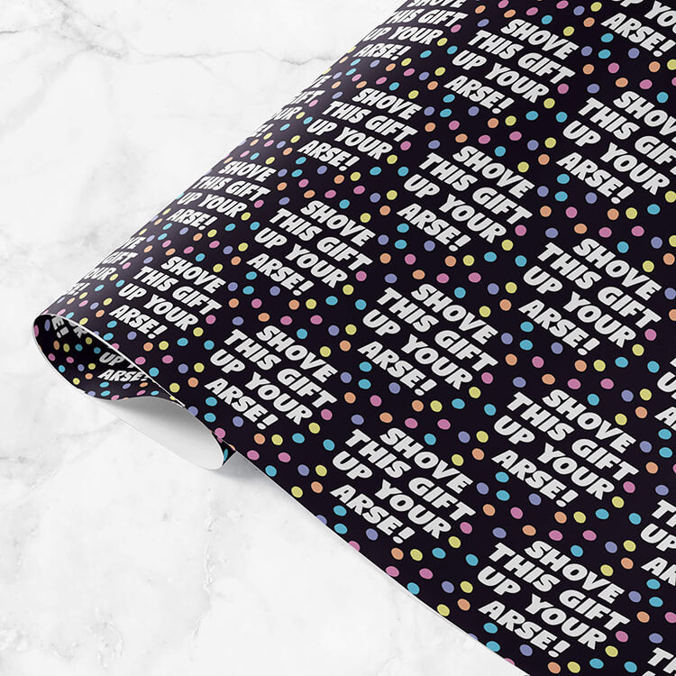 Black birthday wrapping paper with repeated text that reads Shove this gift up your arse surrounded by pastel multicoloured dots.