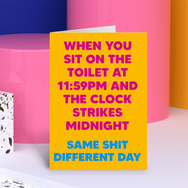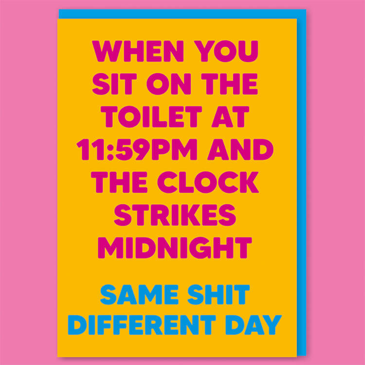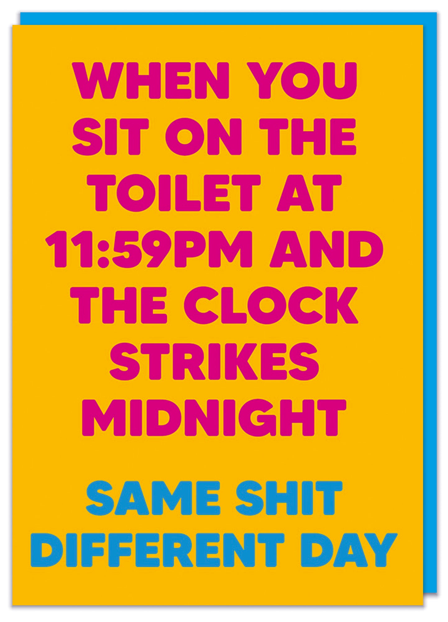 A greeting card featuring bold typographic text arranged in two sections. The text reads “When you sit on the toilet at 11:59pm and the clock strikes midnight” followed by “Same shit different day” at the bottom. The background is a bright yellow colour, with the main text in pink and the final line in blue.