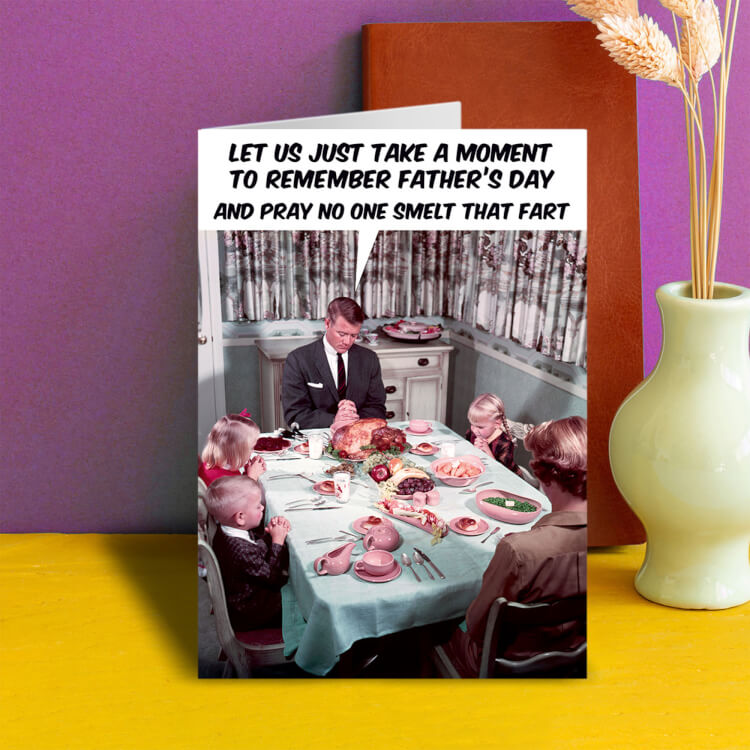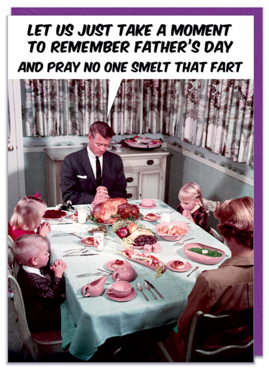 A Fathers Day card with a retro photo of a family all saying grace before a meal. The Dad is saying Let us just take a moment to remember Father's Day and pray no one smelt that fart.
