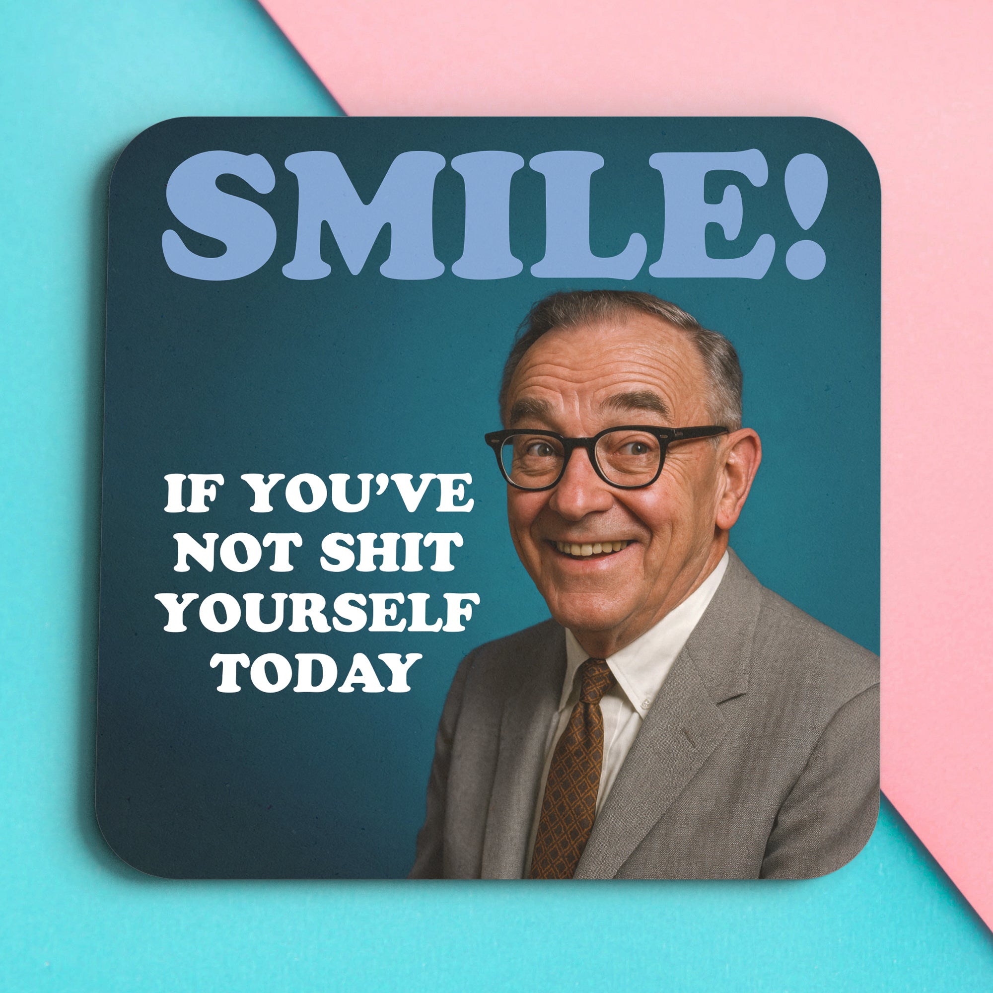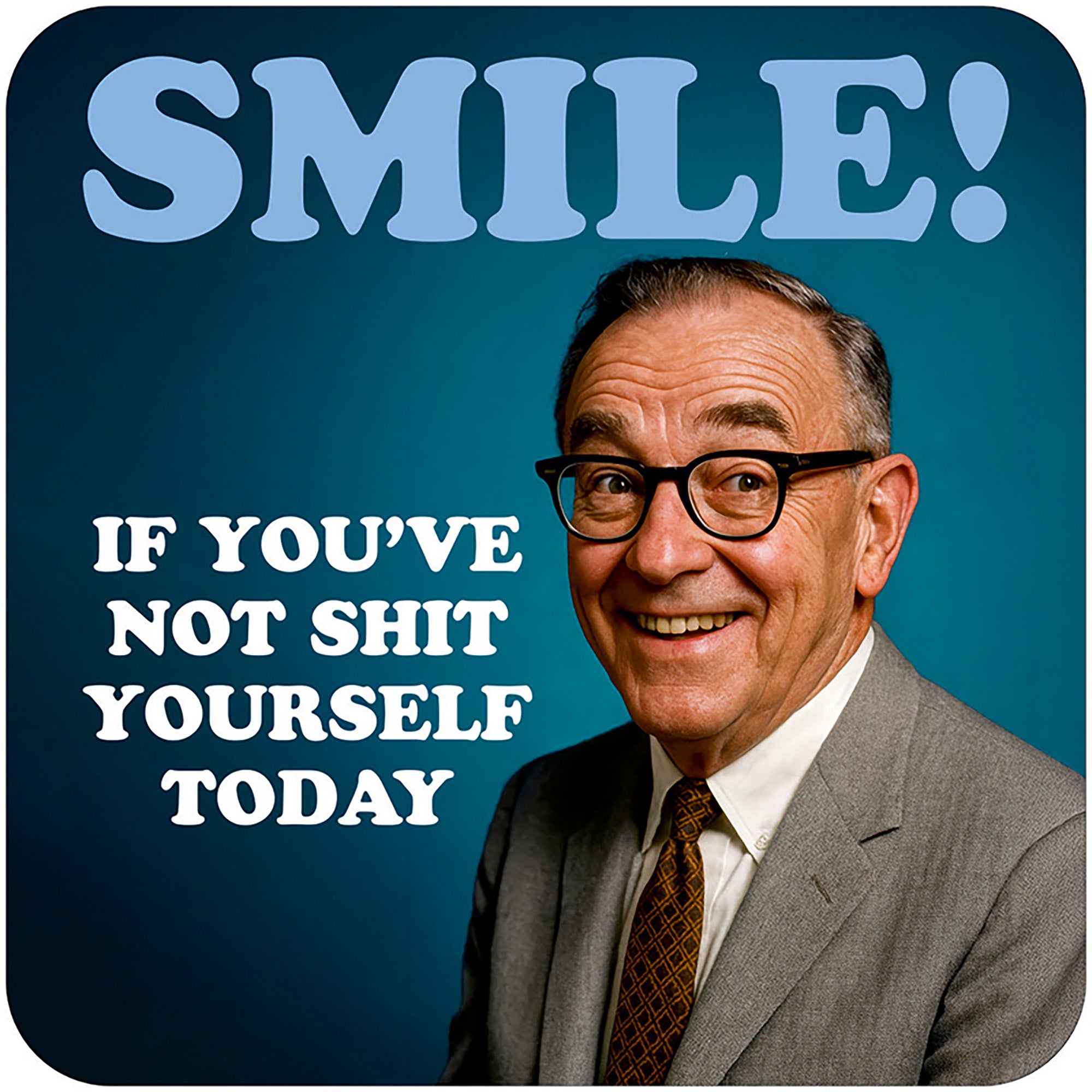Smile! If you’ve not shit yourself today is written in large light blue and white lettering on a square coaster with rounded corners. The design features an older man with a friendly smile, wearing glasses, a grey suit, white shirt, and patterned tie, set against a teal-blue background. He faces the viewer directly, giving the message a cheerful yet cheeky tone. The overall style is retro-inspired, bold, and unapologetically irreverent, combining wholesome visuals with shock-value humour.