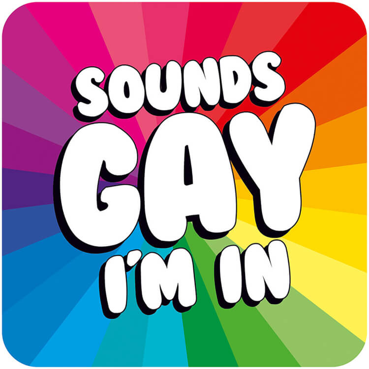 A coaster with a bright rainbow pattern from the centre. Bold white rounded text in the middle reads Sounds Gay I'm in.
