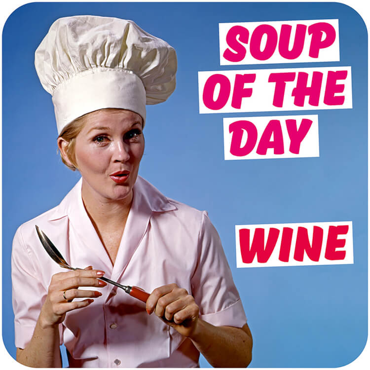 A light blue coaster with a retro-style photo of an excited chef holding a ladle and next to her are the words ‘Soup of the day wine’.
