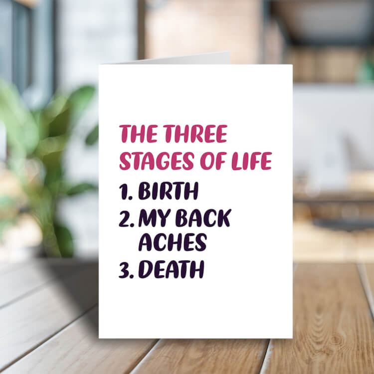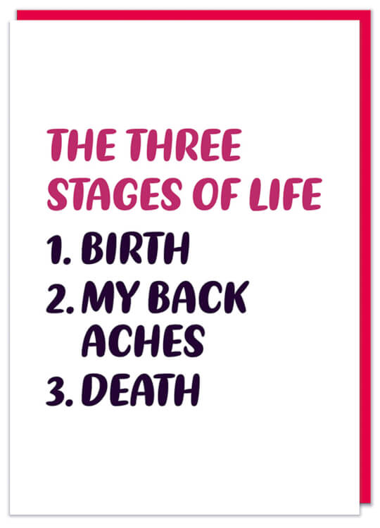 A bold white birthday card with dark red and black text that reads The three stages of life: 1. Birth 2. My back aches 3. Death.