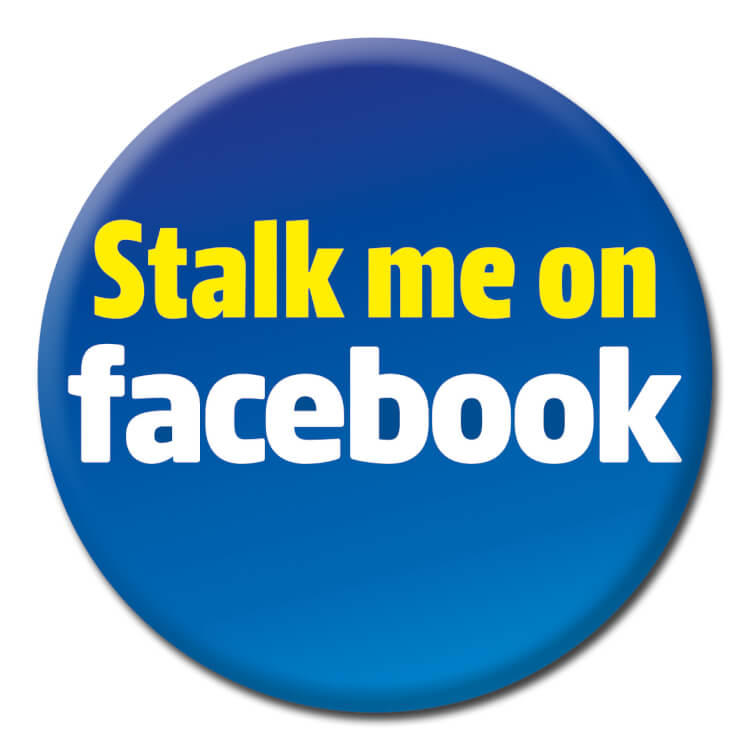 Got a bangin' Facebook profile that makes you look like the bees knees? Whip this badge out in front of someone attractive and voila! A dark blue badge with the words 'stalk me on Facebook' in cheery yellow and bright white lower case, Facebook logo style writing.