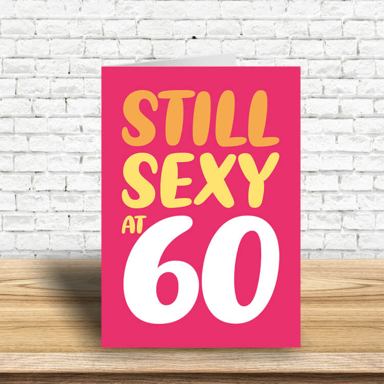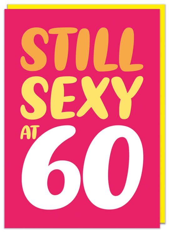 A bright red birthday card with orange, yellow and white rounded letters that reads Still sexy at 60.