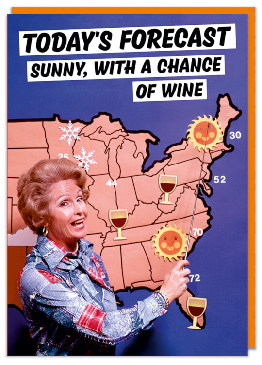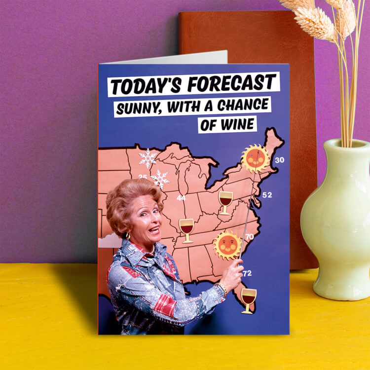 A greeting card with a picture of a smiling female weather reporter standing in front of the United States map. Text above her reads Today's forecast sunny, with a chance of wine.
