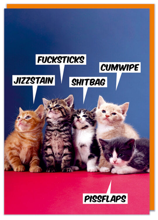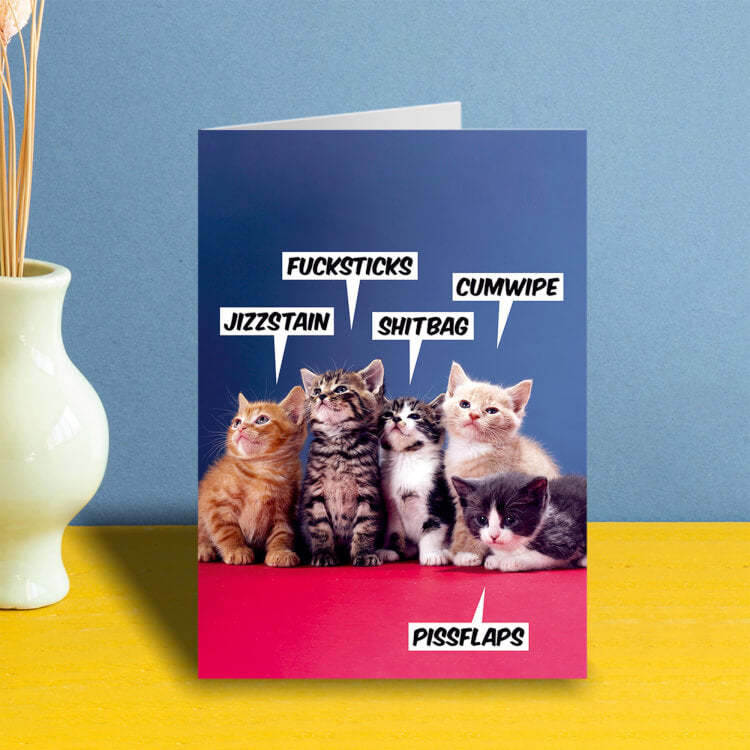 A greeting card with a colourful picture of five cats lying on a red floor against a blue background. Each cat is saying their own swear words of jizzstain, fucksticks, shitbag, cumwipe and pissflaps.