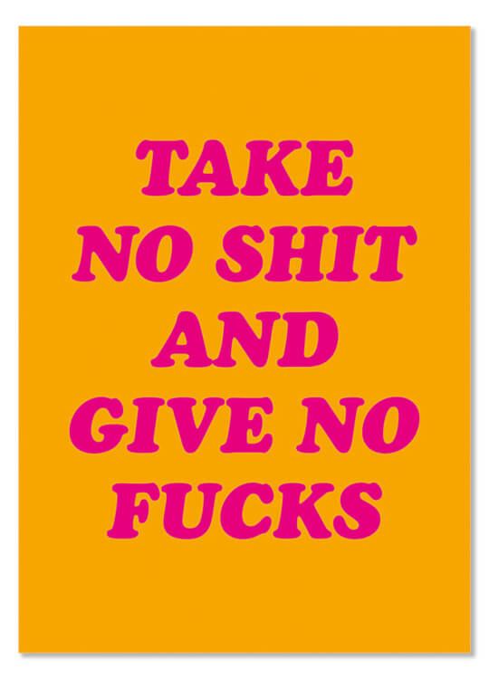 A simple orange postcard with rounded capitalised pink text in the middle that reads Take no shit and give no fucks.
