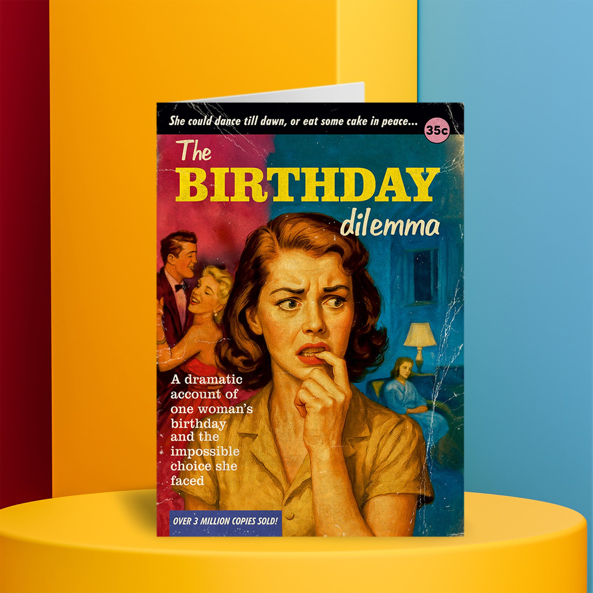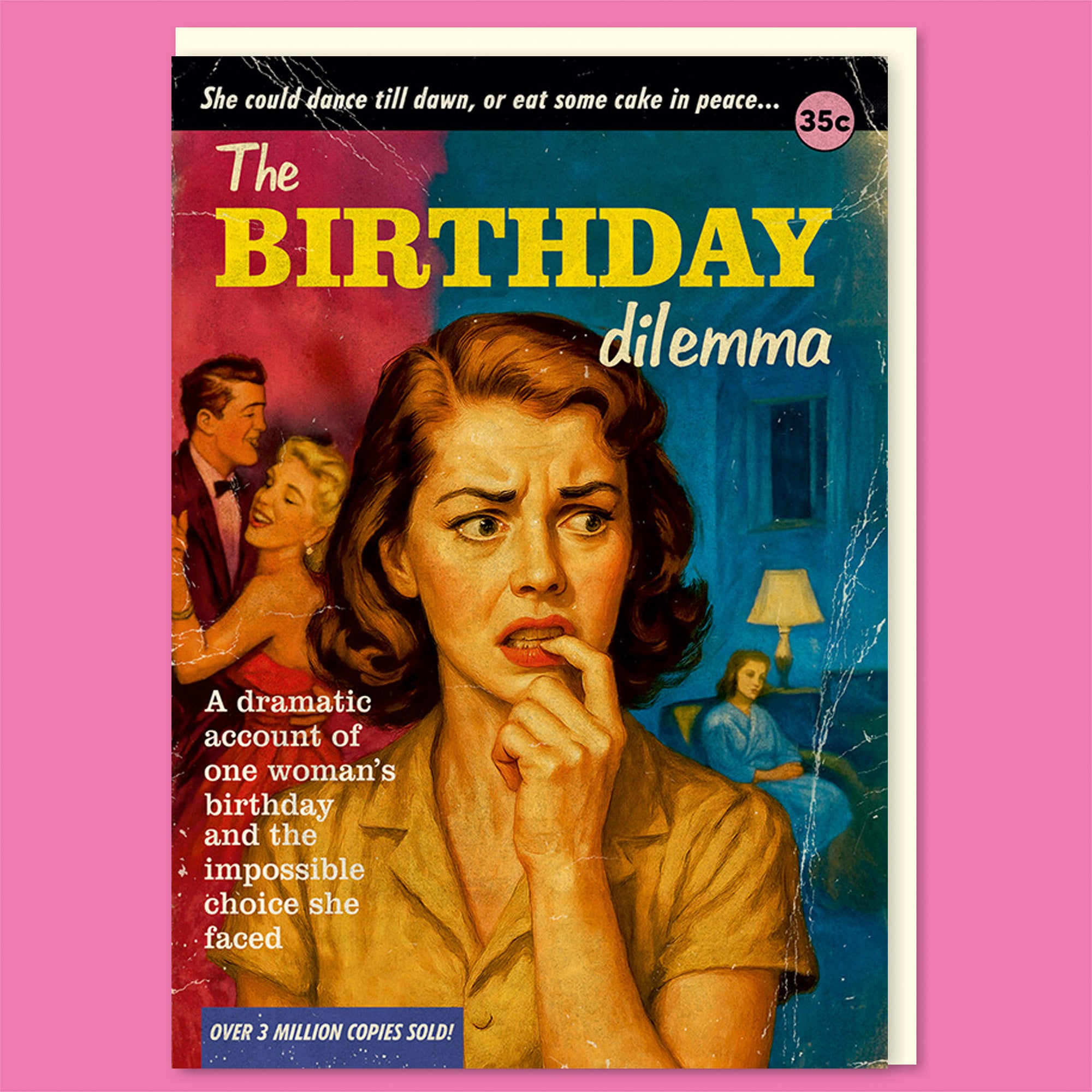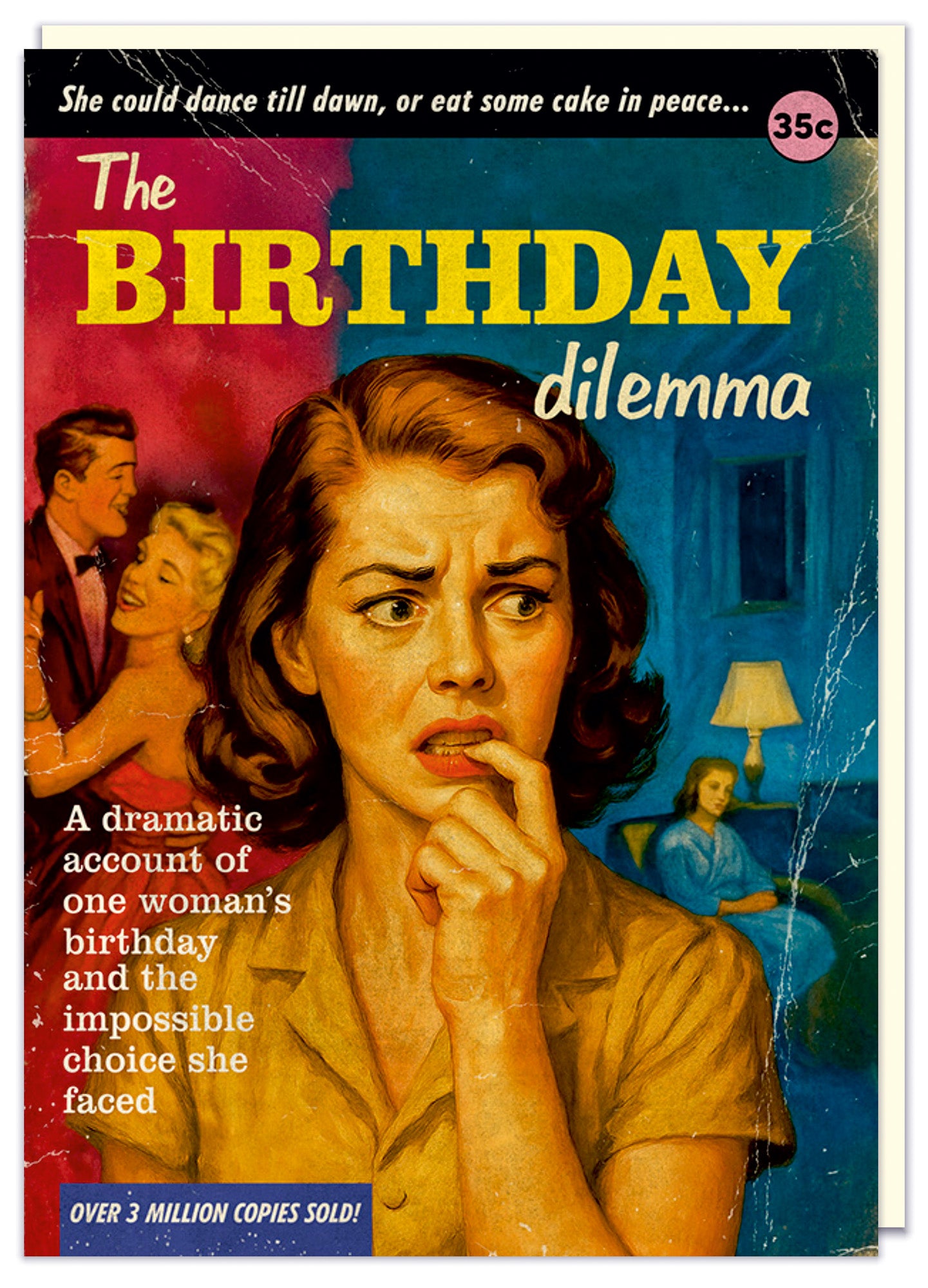 A birthday card designed in the style of a sensational vintage paperback cover, inspired by trashy midcentury pulp novels. The dramatic title reads “The Birthday Dilemma,” surrounded by exaggerated teaser text promising scandal, suspense, and personal turmoil. At the centre, a worried woman bites her finger in deep thought, caught between two very different birthday outcomes — a glamorous party scene on one side and a calm, solitary evening on the other. The composition uses classic pulp illustration techniques with expressive faces and heightened emotion, distressed textures, and theatrical lighting. The colour palette blends rich teal blues, warm yellows, and dusty reds, with faux pricing, bestseller badges, and worn-paper effects completing the retro paperback illusion.