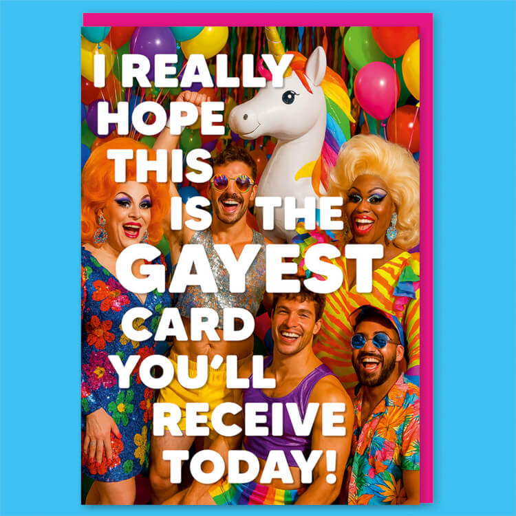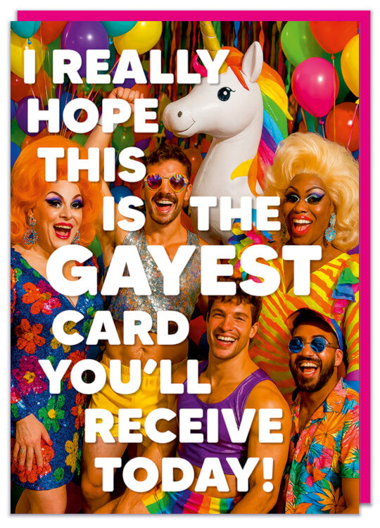 A funny birthday card featuring a very busy scene featuring fabulous drag queens, rainbow unicorns and disco party boys surrounded by multicoloured balloons and streamers. Over the top of this is bold white text that reads I really hope this is the gayest card you'll receive today.