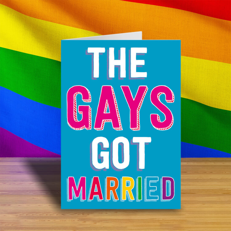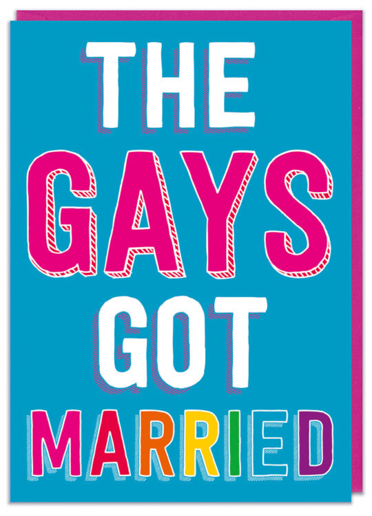 A bright blue wedding card with the words ‘The gays got married’ in capitalised white, pink and rainbow 3D font.
