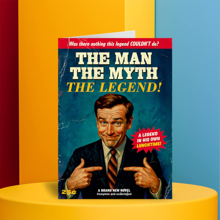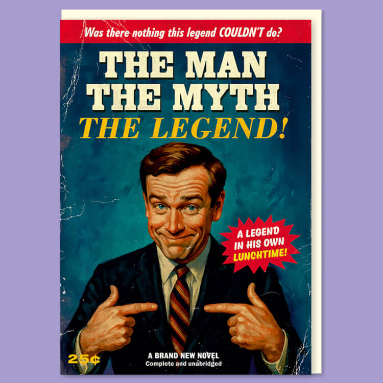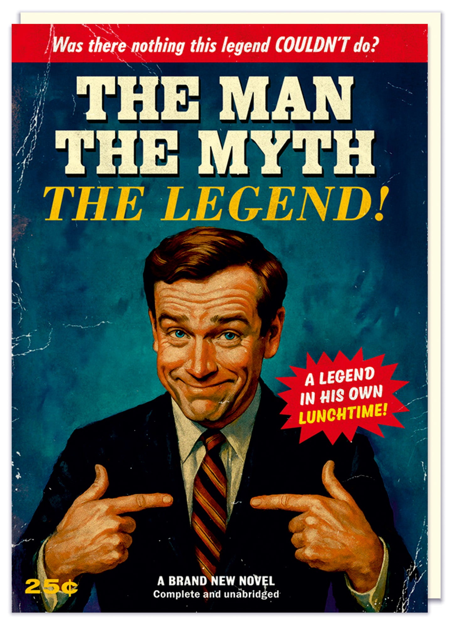 A greeting card styled like a vintage paperback cover inspired by trashy midcentury pulp novels. The main headline text reads “The Man. The Myth. The Legend!” with a tagline at the top saying “Was there nothing this legend couldn’t do?” and a starburst declaring “A legend in his own lunchtime!” The illustration shows a smirking suited man pointing proudly at himself. The design uses distressed textures, dramatic shading, and bold cream and yellow lettering against a teal background, echoing classic pulp fiction aesthetics.