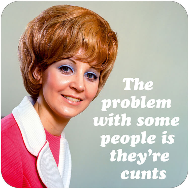A rude coaster with a close up of a smiling ginger haired woman with a bright pink top and bold blue eyeliner looking to camera. White slanted text next to her reads The problem with some people is they're cunts.