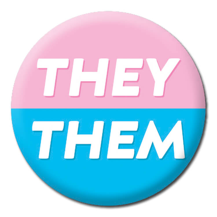 A pale pink and blue badge with slanted text reading the pronouns They Them.
