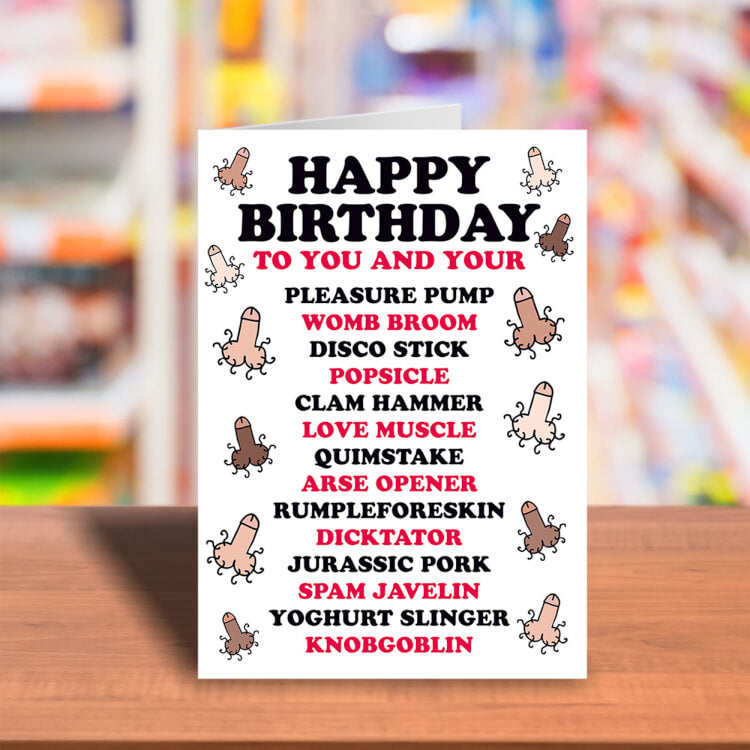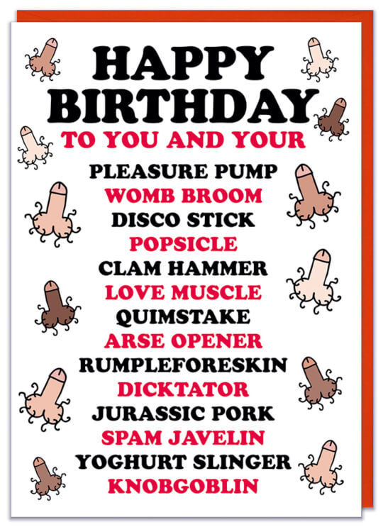 A white greeting card with rounded alternating black and red text wishing Happy Birthday to you and your pleasure pump, womb broom, disco stick, popsicle, clam hammer, love muscle, quimstake, arse opener, rumpleforeskin, dicktator, jurassic pork, spam javelin, yoghurt slinger and knobgoblin. This text is surrounded by cute little multicoloured penises.