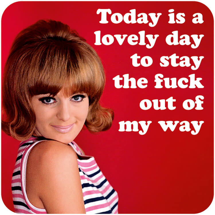 A coaster featuring a retro picture of a smiling woman looking to camera against a red background. White rounded text to her right reads Today is a lovely day to stay the fuck out of my way.