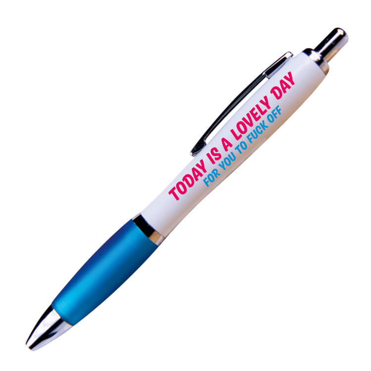 A white ballpoint pen with a dark blue grip and black ink. Pink and blue text on one side reads Today is a lovely day for you to fuck off.