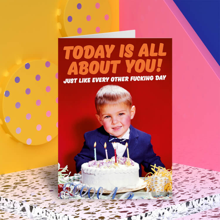 A birthday card with a 1960s picture of smiling young boy sitting in front of a birthday cake. Orange and white text above him reads Today is all about you! Just like every other fucking day.