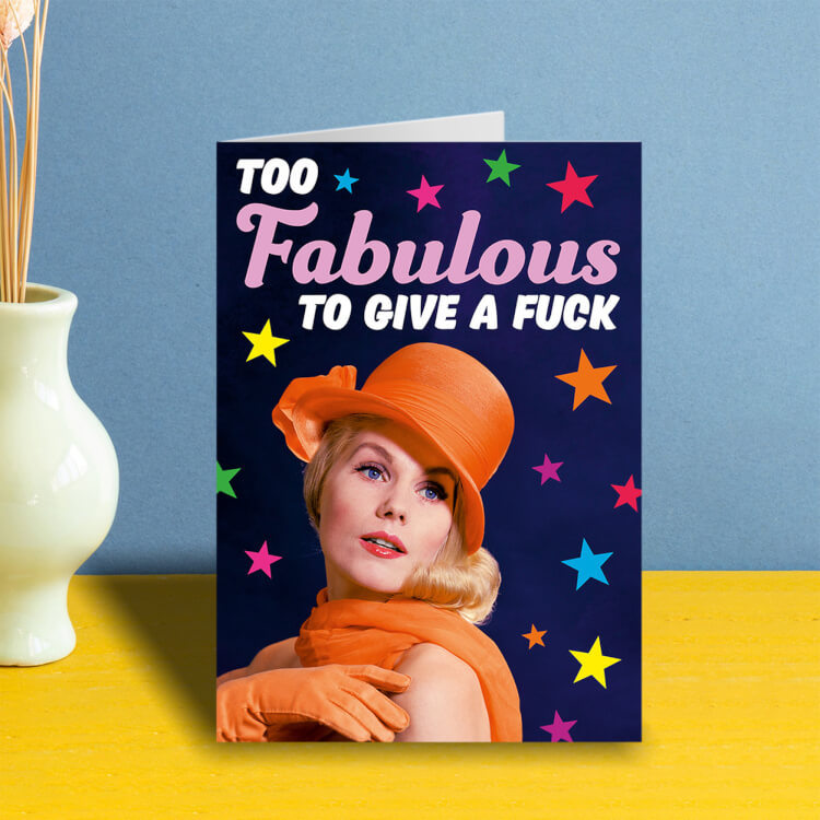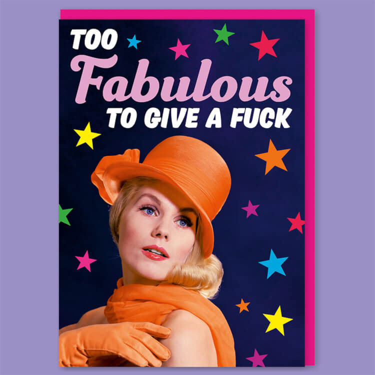 A greeting card with a glamorous looking woman in a orange dress surrounded by multicoloured stars. The card reads Too fabulous to give a fuck