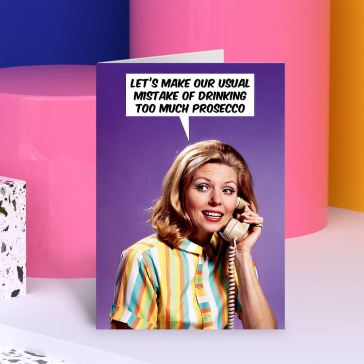 A funny birthday card with a retro photo of a young woman in a stripy dress on the phone. She is asking Let's make our usual mistake of drinking too much prosecco.
