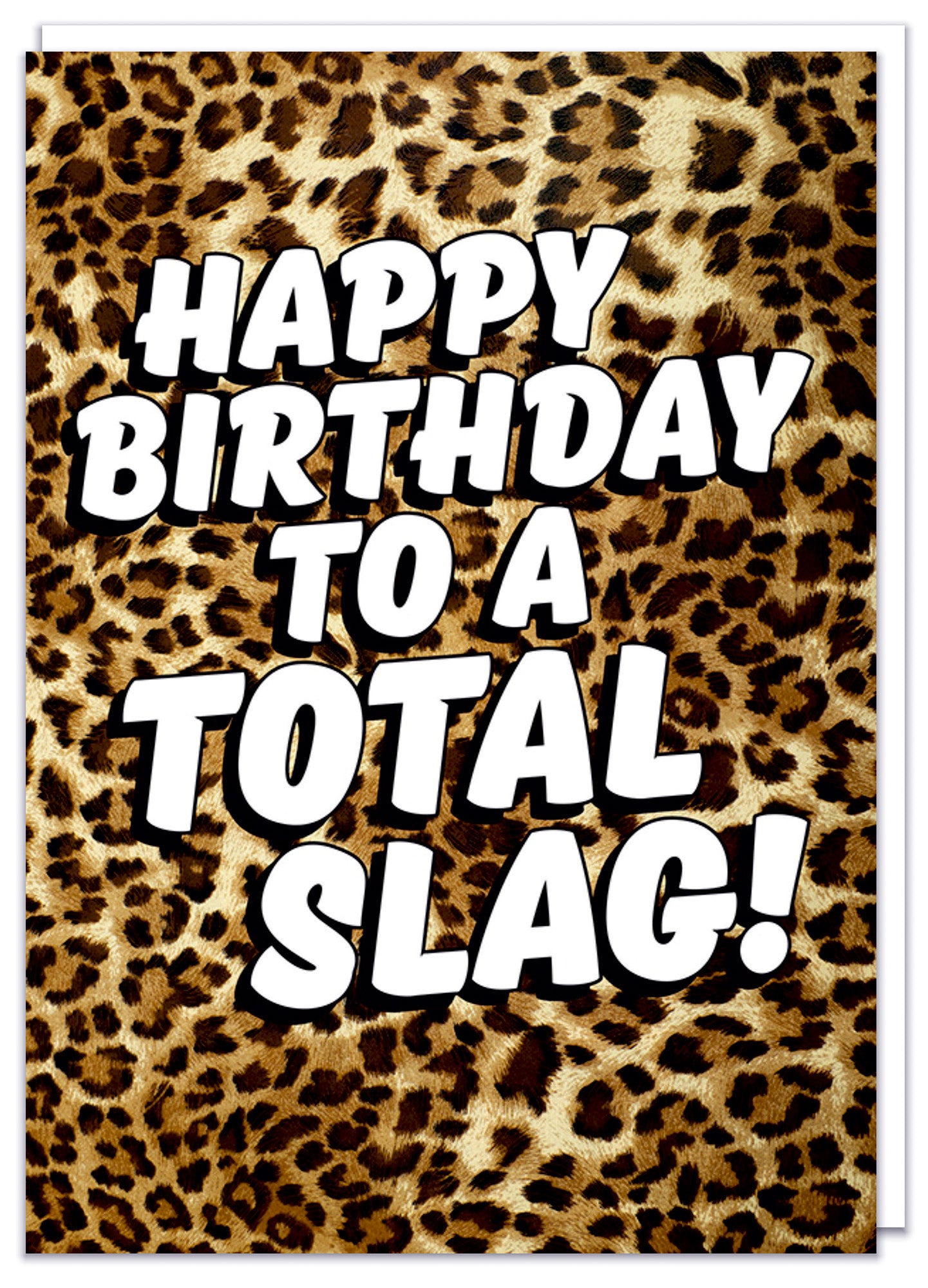 A leopard print birthday card with bold white text that reads Happy birthday to a total slag.