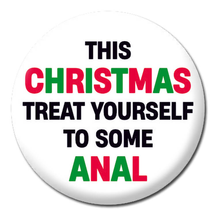 A white badge with black, red and green text that reads This Christmas treat yourself to some anal.