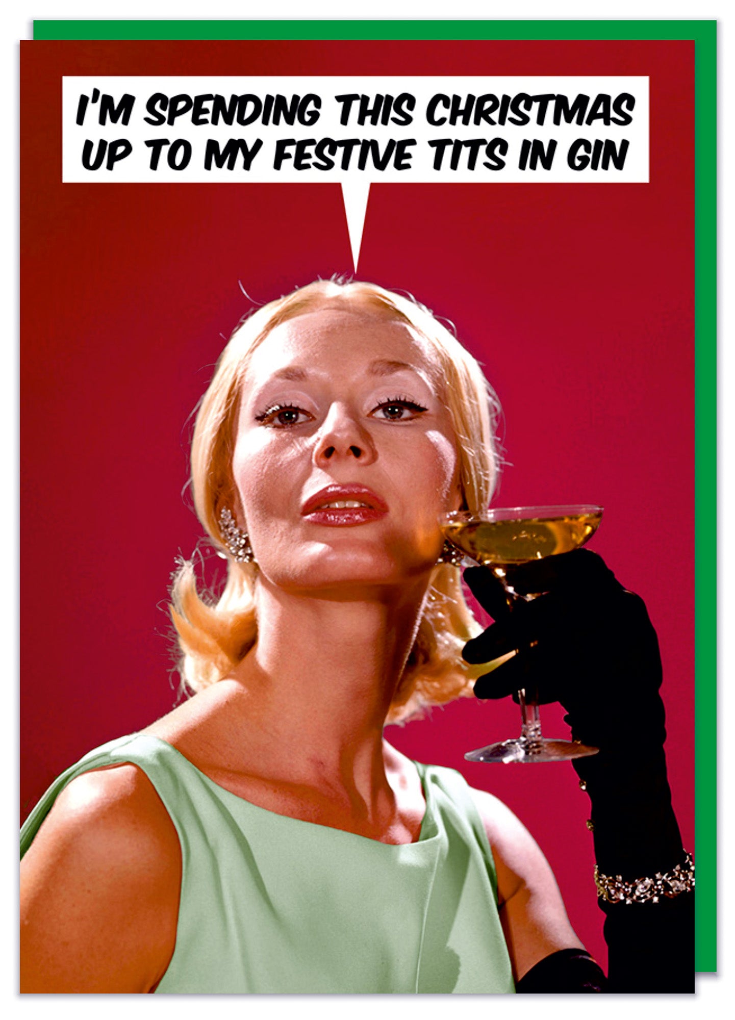 A funny Christmas card with a vintage photo of a glamorous looking woman against a red background holding a cocktail glass to her mouth. She says I'm spending this Christmas up to my tits in festive gin.