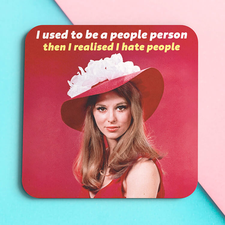 A coaster with a glamorous looking woman in a big red hat and above her yellow and white text reads I used to be a people person then i realised I hate people