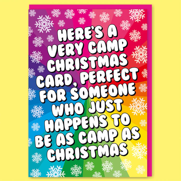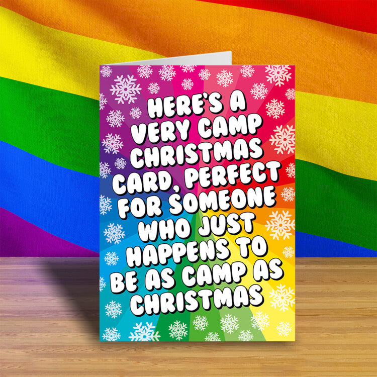 A rainbow explosion Christmas card with curvy white text with a black outline that reads Here's a very camp Christmas card , perfect for someone who just happens to be as camp as Christmas.