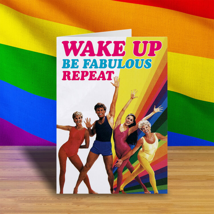 A birthday card with a photo of 1970s aerobic dancers in front of a rainbow pattern. Text above reads Wake Up Be fabulous Repeat.