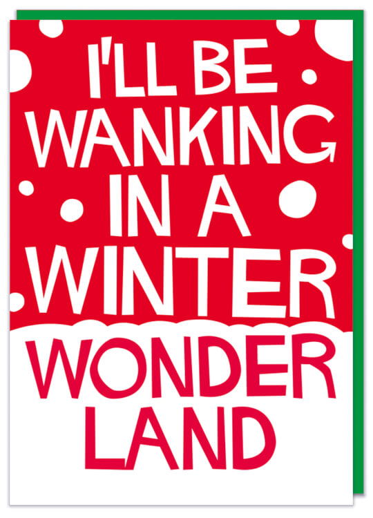 A Christmas card with a red background. White text reads I'll be walking in a winter wankerland.