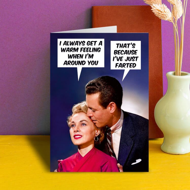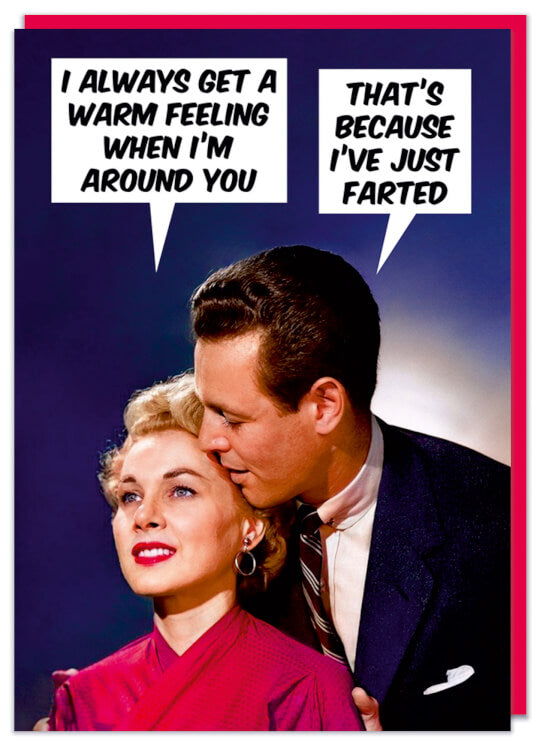 A funny retro birthday card with a man and woman in a close smooch. She says I always get a warm feeling when I'm around you to which he replies That's because I've just farted.