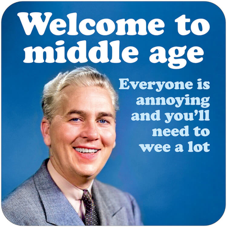 A retro coaster with a picture of a smiling older man in a suit against a deep blue background. White and light blue text above and beside him reads Welcome to middle age. Everyone is annoying and you'll need to wee a lot.